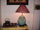 -It is made of porcelain with gross green enamel. It is decorated with a hand made dragon on the neck. The image of clouds is sunk on body. The shade is made of bamboo and you can change at different heights. This lamp is put on wooden basement. This type of table lamp is designed according to Chinese feudal art. It is a symbol of delicate ceramic art.